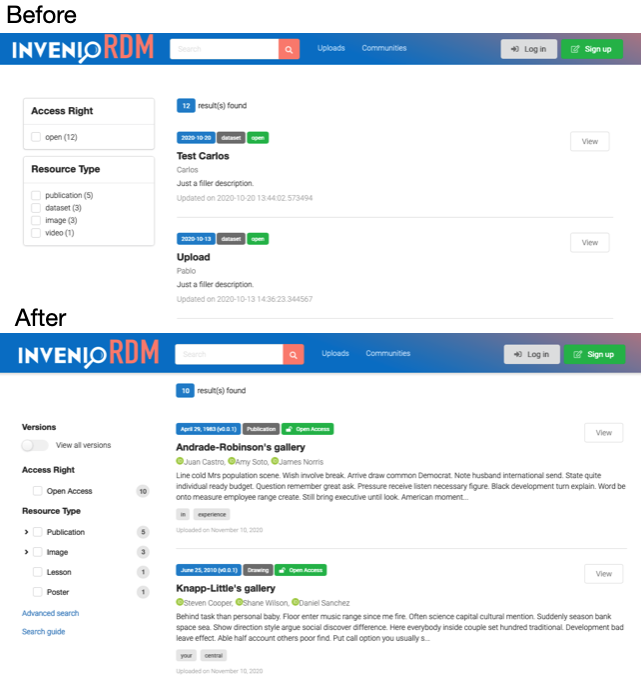 We have done a lot of work on improving the UX of the primary pages such as the frontpage, search results and record landing page. Below you can see some screenshots of before/after: