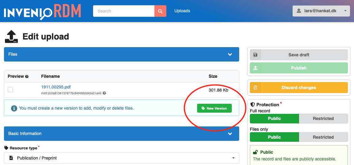 Now, a user can create a new version of the record, add or remove files and publish it by clicking the "New version" button.