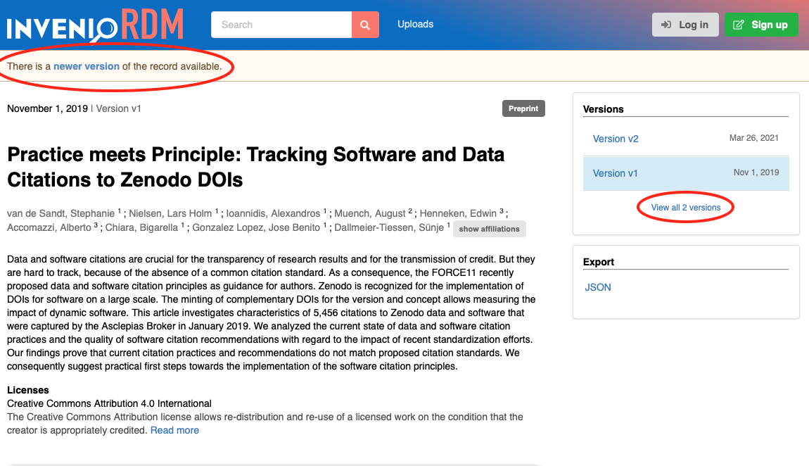 The landing page for previous versions of a record clearly displays that a newer version exists, with a link to it.