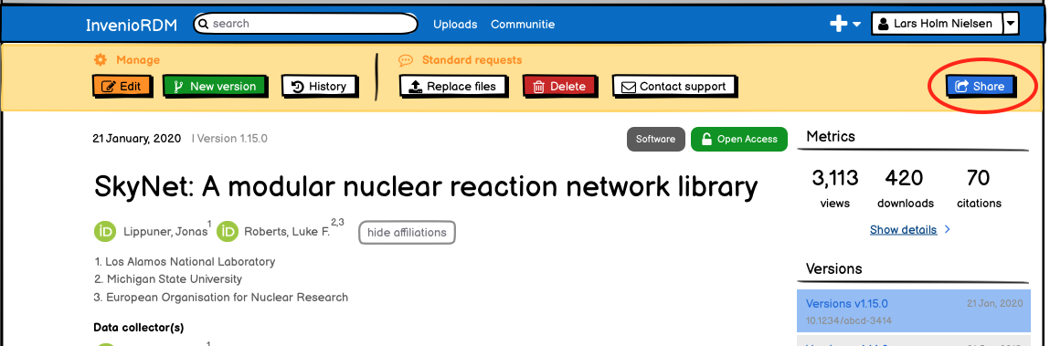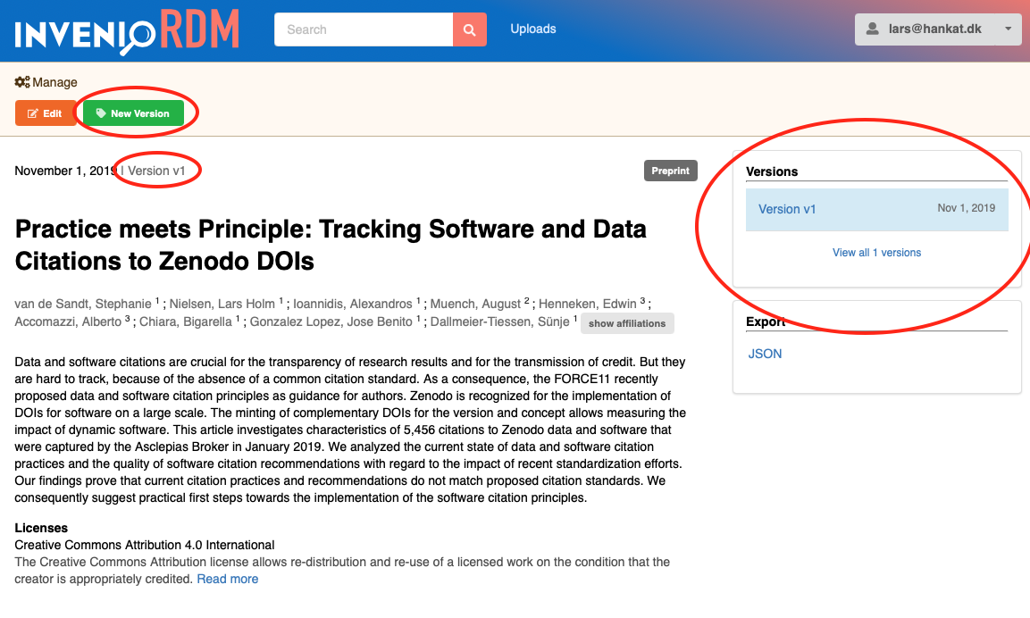 One way to make new versions is from the record's landing page directly by clicking on the "New Version" button. Only allowed users can do so: