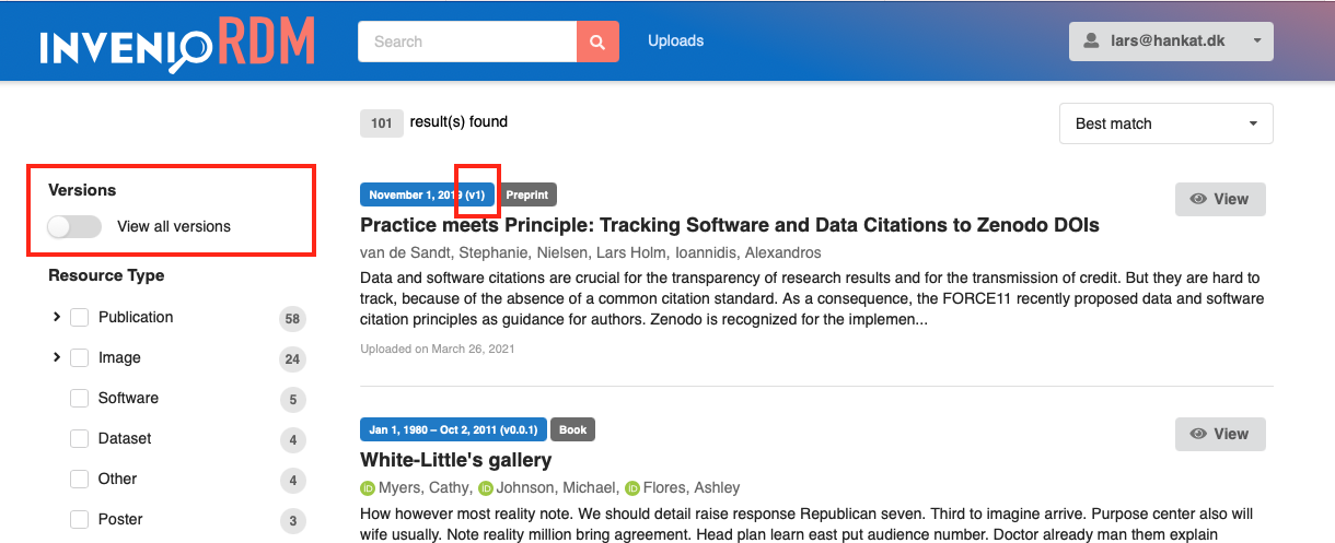 Search results will by default only display the latest published version of a record. However, toggling the flip switch in the versions facet, allows you to view and search all versions.