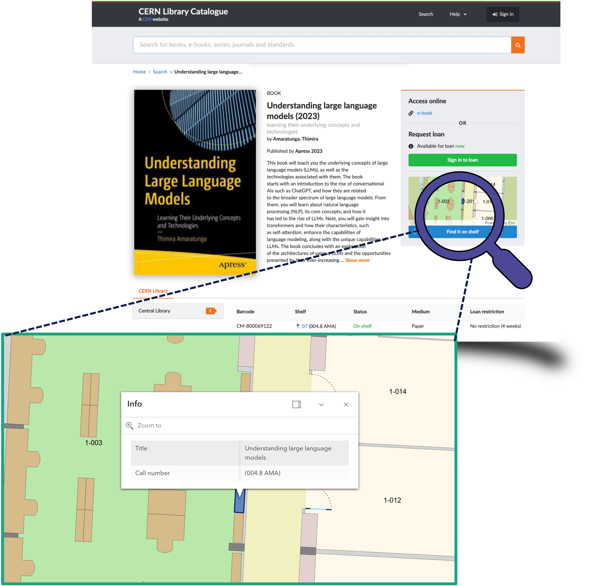 CERN’s library offers mobile self-checkout, enabling patrons to borrow items directly from their phones. Through InvenioILS APIs, the system also integrates with CERN’s internal navigation app, guiding users to shelf locations and showing real-time item availability.